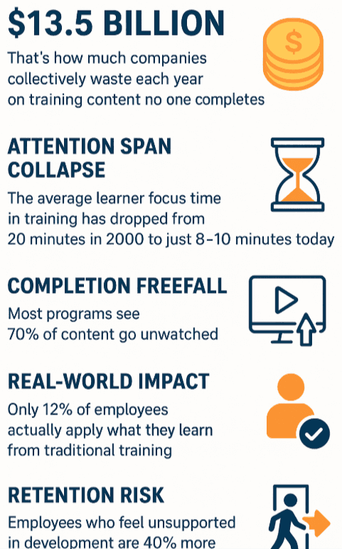 Most companies waste thousands per employee on training that no one completes. With falling attention spans, one-size-fits-all content, and outdated formats, engagement drops fast—until teams switch to shorter, visual, interactive learning.